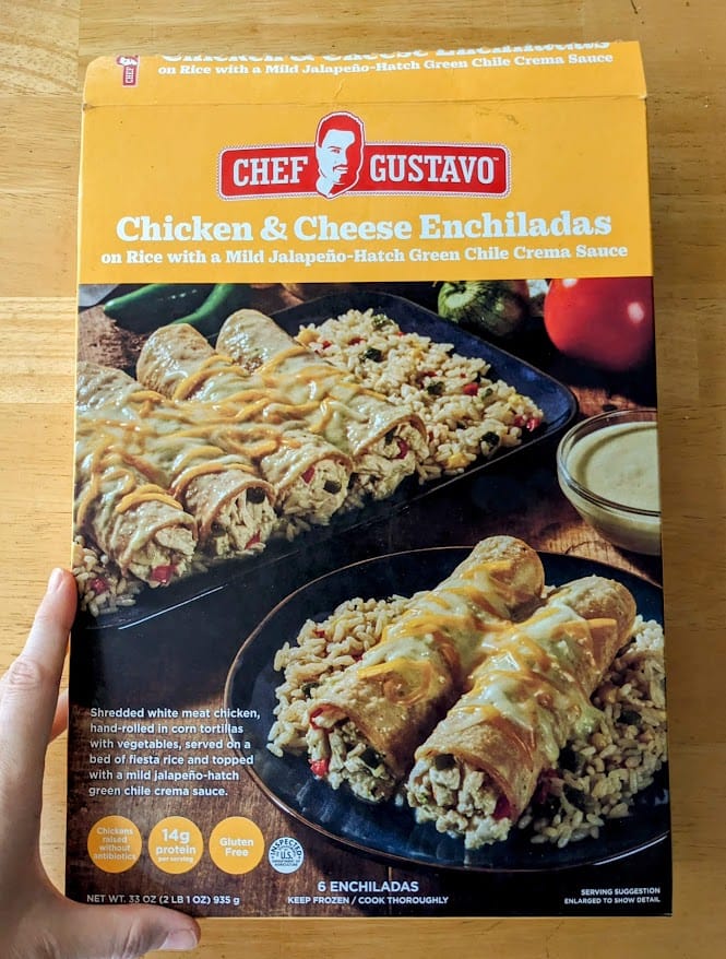 These little frozen dudes come in a cardboard tray, which can be microwaved -or- baked in the oven. You get six chicken-and-cheese enchiladas in corn tortillas over a bed of rice. The top is covered in a crema sauce made with hatch green chiles and jalapenos.